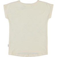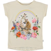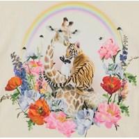 Ragnhilde är en ljusrosa t-shirt med tryck av en giraff, tiger och kanin med en blomkrans runt och en regnbåge ovanpå. T-shirten har väldigt korta ärmar och är längre baktill.