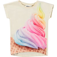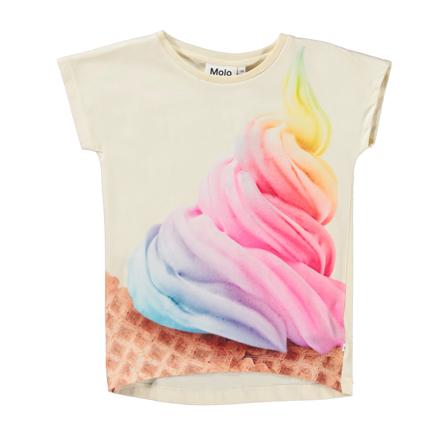 Rosa kortärmad t-shirt i 100% ekologisk bomull. Här ses en stpr mjukglass i regnbågens alla färger. T-shirten har en rund hals med ribbkant och är något längre baktill, samt har en normal passform.