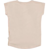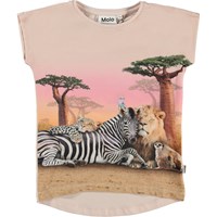 Ragnhilde är en rosa t-shirt i ekologisk bomull med något längre baksida. Toppen är i mönstret Wild Wonderful, där savannens djur ligger och myser tillsammans.