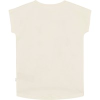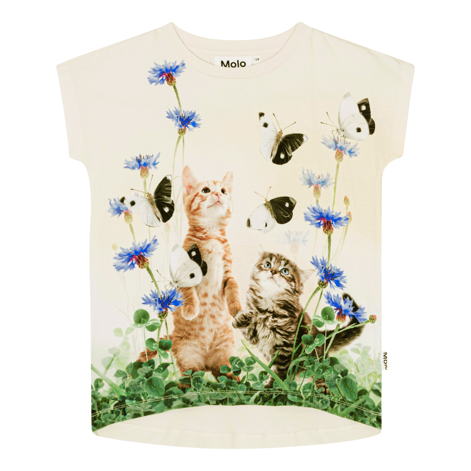 Vit ärmlös t-shirt i ekologisk bomull med nyfikna kattungar. T-shirten har en lös passform och är något längre baktill.