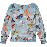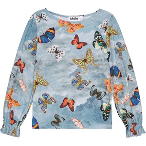 Blå långärmad tröja i ekologisk bomull med ett tryck av färgglada fjärilar. Tröjan har en rund hals, ärmar med rynkor och elastik vid handleden, vilket ger en liten volang.
