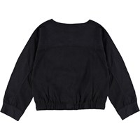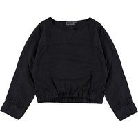 Raisi är en svart långärmad blus i tvättad look med breda ärmar. Blusen har en kort passform med knytband i nedtill.