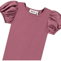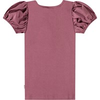 Lila åtsittande t-shirt i mjuk ekologisk bomullsribb med en rund halsringning och puffärmar med resår i kanten.