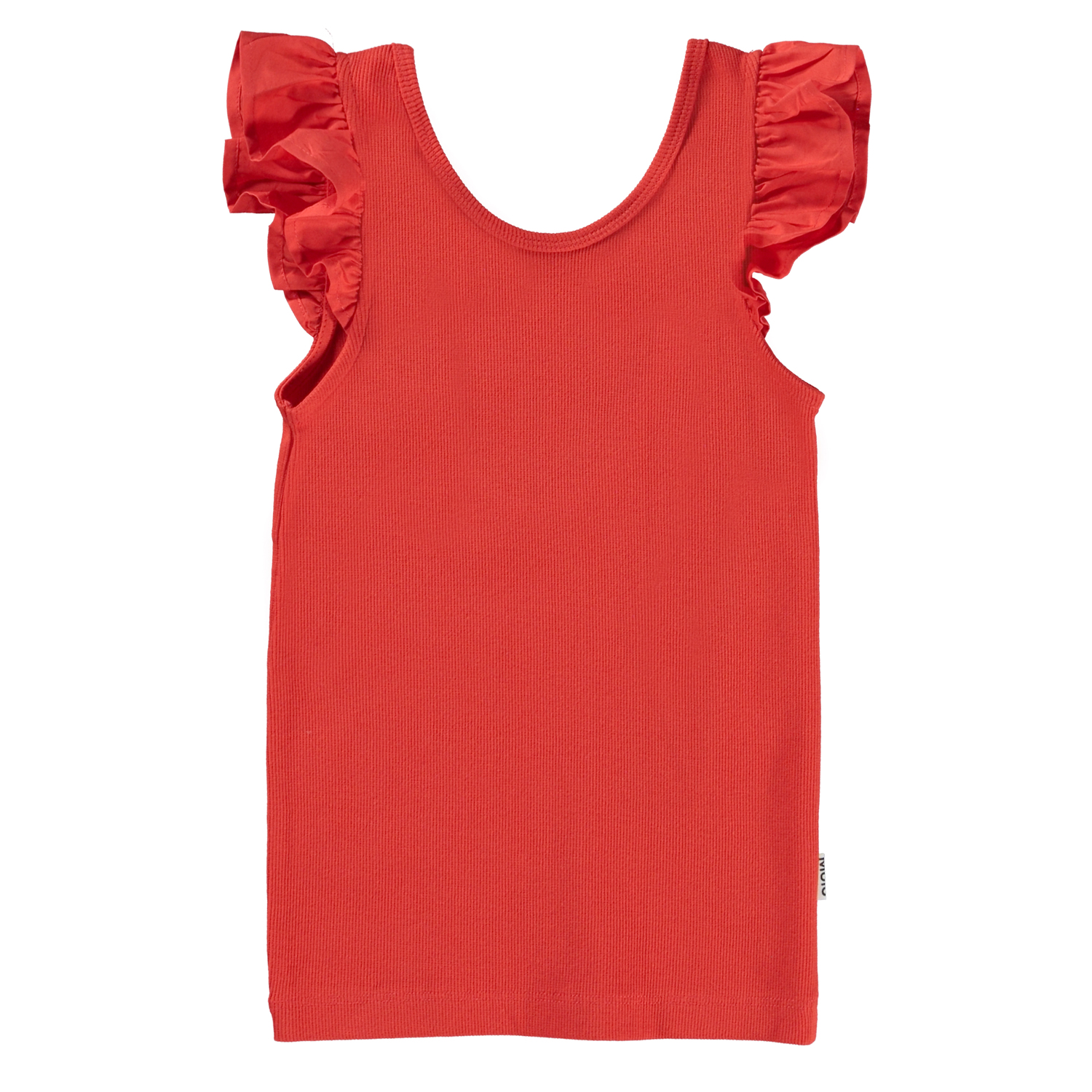 Ranja är ett linne i rött, som tar vilken outfit som helst till en ny nivå. Med sina fina poplinvolanger på axlarna är Ranja perfekt både till vardag och till fest.