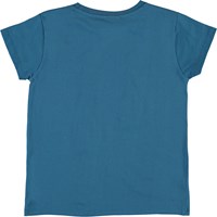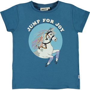 Ranva är en blå t-shirt med ett print av en häst som springer genom ett hål. På t-shirten står även texten 'Jump for joy’.