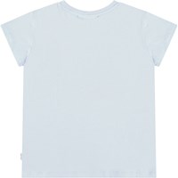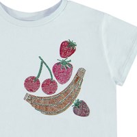 Ljusblå kortärmad t-shirt i ekologisk bomull med en rund halsringning. T-shirten har en normal passform med frukter på bröstet gjorda av blanka paljetter.