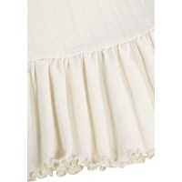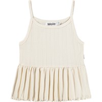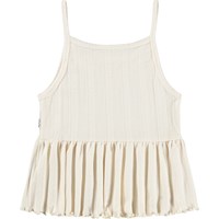 Off-white, ärmlös topp i ekologisk bomull med smala axelband. Toppen har ett subtilt hålmönster och avslutas med en bred, plisserad volangkant, vilket ger ett lätt och lekfullt utseende.
