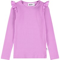 Rosa långärmad åtsittande topp i mjuk ekologisk bomullsribb med rund hals och volangdetalj på axeln.
