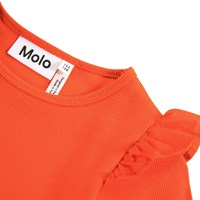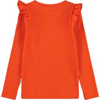 Röd långärmad åtsittande topp i mjuk ekologisk bomullsribb med rund hals och volangdetalj på axeln.