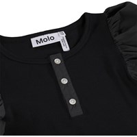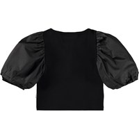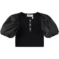 Svart kort T-shirt i mjuk, ekologisk bomull med rund hals och tre knappar framtill. T-shirten har en åtsittande passform med puffärmar i fast bomull, vilket ger ett stilfullt uttryck.