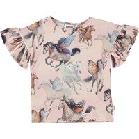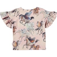 Rayah är en rosa topp i ekologisk bomull. Rayah har droppad axel med volang i botten, vilket ger en fin och lekande look. Toppen är i mönstret Fairy Horses, med galopperande hästar med fjärilsvingar.
