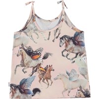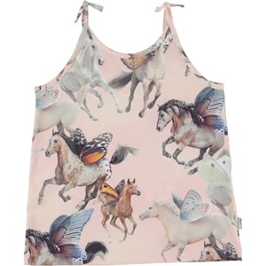 Reba är ett rosa linne i ekologisk bomull. Axelbanden är knutna, som en cool detalj. Reba är i mönstret Fairy horses, där man kan se galopperande hästar med fjärilsvingar.