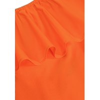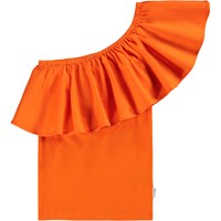 Röd topp med en axel, i ekologisk bomullsjersey med en åtsittande passform och en bred poplinvolang som löper över axeln och runt ryggen.