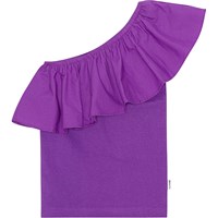 Blå enaxlad topp i ekologisk bomull med stretch. Toppen har en tight passform och en bred poplinvolang upptill.