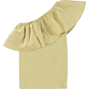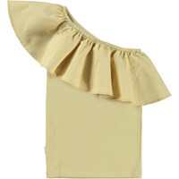 Rebecca är en ljus, soft gul topp med en axel bar i ekologisk bomull. Toppen är i stretch med en stor och fin poplin volang över den ena axeln, och runtom.