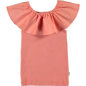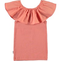 Reca är ett koralfärgat ribbat linne med en bred volangkant upptill, som kan dras ner över axlarna.