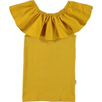 Reca är ett guldigt ribbat linne med en bred volangkant upptill, som kan dras ner över axlarna.