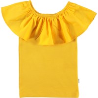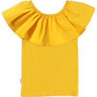 Reca är en solgul topp i ekologisk bomull, utan ärmar och med en fin volangkrage i poplin. Kragen kan användas både uppe på axlarna och nere som en off shoulder topp.