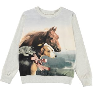 Regine är en ljusgrå tröja med en häst, hund, katt och fågel framtill.