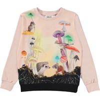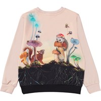 Rosa tröja med månskensmönster. Här visas det som händer på natten i månens trädgård. En trädgård där blommorna bara blommar när solen går ner. Blommor med namn som nattens drottning, månblommor, änglatrumpet, nattljus och nattblommande jasmin. En plats dit äventyrslystna djur kommer. Varg och lamm, uggla och fjäril, isbjörn och grönögda katter. Kaninungar och rådjurskid. Gigantiska svampar stora som träd och luften fylld av natten ljud. omfamna trollen och klä ut dig till ett av skogens barn, som en rådjursunge eller ett träd. Denna tröja är tillverkad i 100% bomull, har långa ärmar med ribbkant, rund hals med ribbkant och en lös passsform.