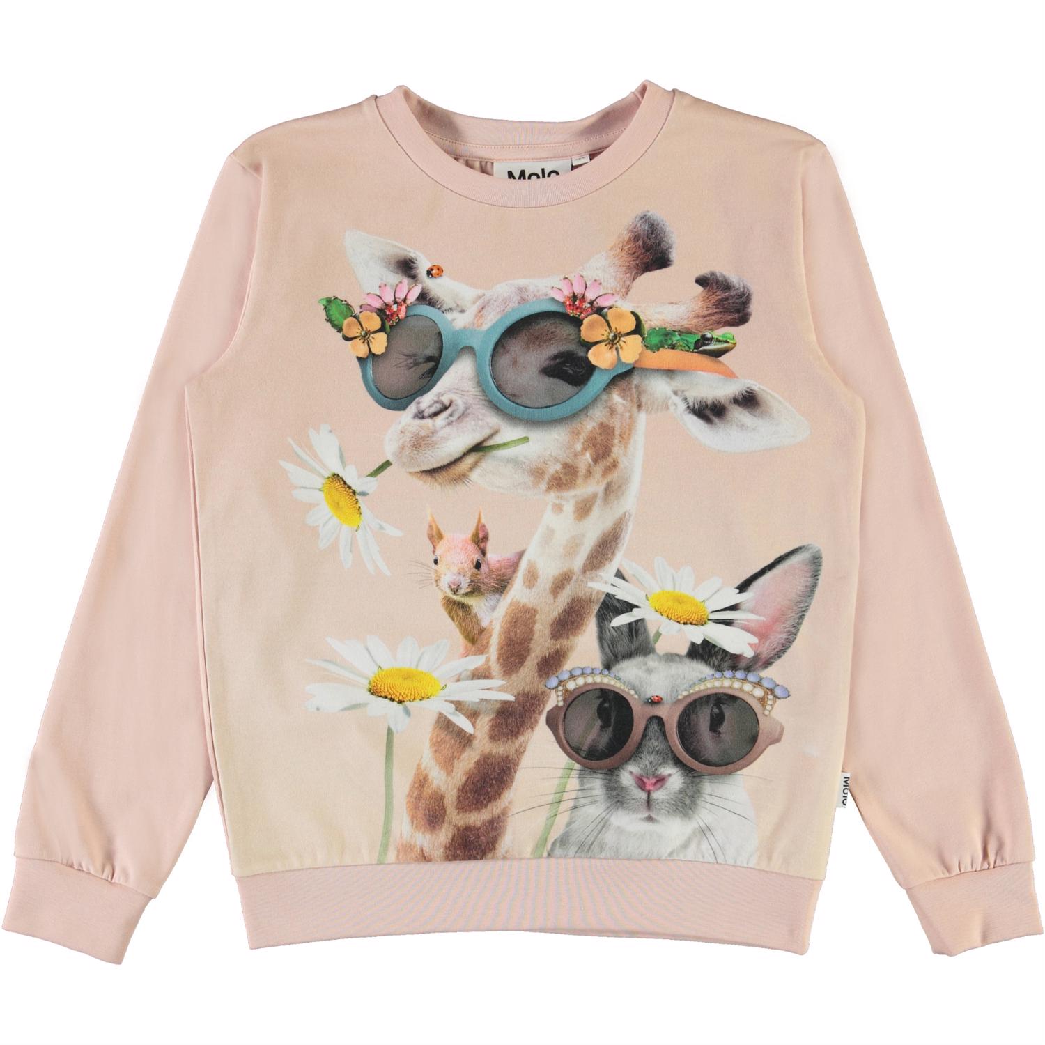 Regine är en rosa tröja med ett tryck av en giraff, kanin och ekorre som trivs med solglasögon på.