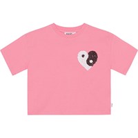 Rosa kortärmad t-shirt i 100% ekologisk bomull med ett paljetthjärta i svart och vitt på bröstet. T-shirten har rund hals och en lös passform.