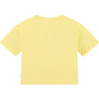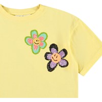 Gul t-shirt i mjuk ekologisk bomull med ribbad halsringning. T-shirten har en lös passform med två paljettsömmar av färgglada blommor på bröstet.