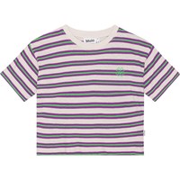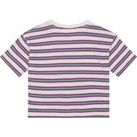 Beige kortärmad t-shirt i en mjuk bomullsblandning med lila och gröna ränder. T-shirten har en lös passform, en beige ribbkant vid halsen och fyra hjärtan som bildar ett fyrklöver vid bröstet.