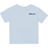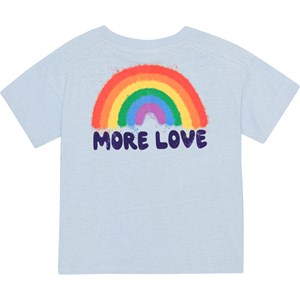 Blå kortärmad t-shirt i 100% ekologisk bomull med vår ikoniska regnbåge och texten "More LOve" fram- och baktill. T-shirten har raglanärmar och en normal passform.