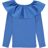 Renate är en blå långärmad tröja i ribbad kvalitet med stor volangkrage, som antingen kan sitta uppe på axlarna eller dras ner så att axlarna visas.