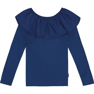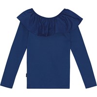 Mörkblå, tight långärmad topp i ekologisk bomullsribb med en poplinkrage och elastik, som kan bäras off-shoulder eller lyftas upp för att fungera både som krage och ärmslut.