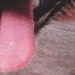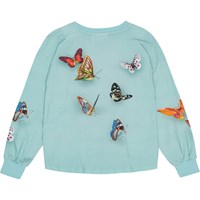 Ljusblå långärmad tröja i ekologisk bomull med lös passform, rund hals och ribbade kanter. Tröjan är längre baktill än framtill och på framsidan finns ett tryck av en glad hund som hoppar ut urtröjan, omgiven av färgglada fjärilar.