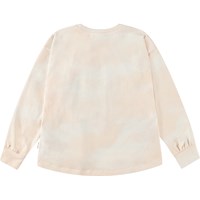 Vit och puderfärgad långärmad tröja i ekologisk bomull med en lös passform, rund hals och ribbade kanter. Tröjan är längre bak än fram med err festligt tryck på framsidan av en häst med vingar och en zebra med gröna ränder, båda bär färgglada blommor i sina munnar.