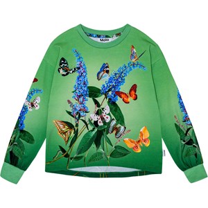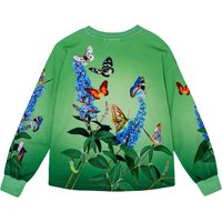 Grön långärmad tröja i ekologisk bomull med lös passform, rund hals och ribbade kanter. Tröjan är längre bak än fram med färgglada fjärilar som flyger runt blå fjärilsblommor på framsidan och längs ärmarna.