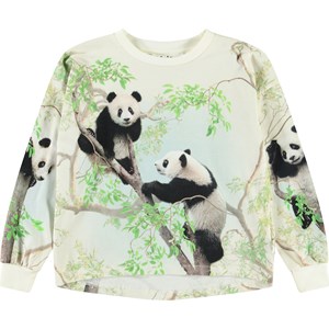 Off-white långärmad topp i mjuk ekologisk bomull med muddar och ribbad halsringning. Toppen har en lös passform och är längre bak. Den har ett mönster av pandor som klättrar i träd.