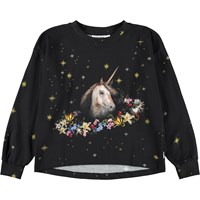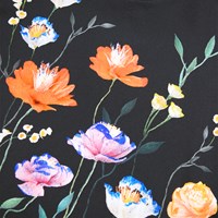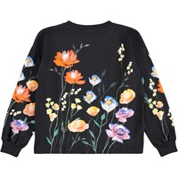 Svart långärmad topp i mjuk ekologisk bomull med ribbade muddar och halsringning. Blusen har en lös passform och är längre baktill med färgglada pappersblommor.