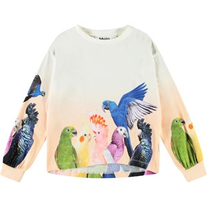Ljusbeige och ljusorange långärmad topp i mjuk ekologisk bomull med muddar och ribbad halsringning. Den långärmade toppen har en lös passform och är längre bak. Den har ett mönster med färgglada papegojor.