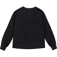 Långärmad svart tröja i ekologisk bomull med lös passform, rund hals och ribbade kanter. Tröjan är längre bak än fram och framsidan visar en galopperande häst med berg i bakgrunden och en regnbågsfärgad himmel.