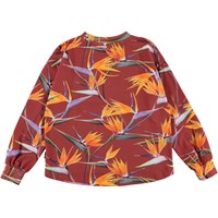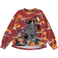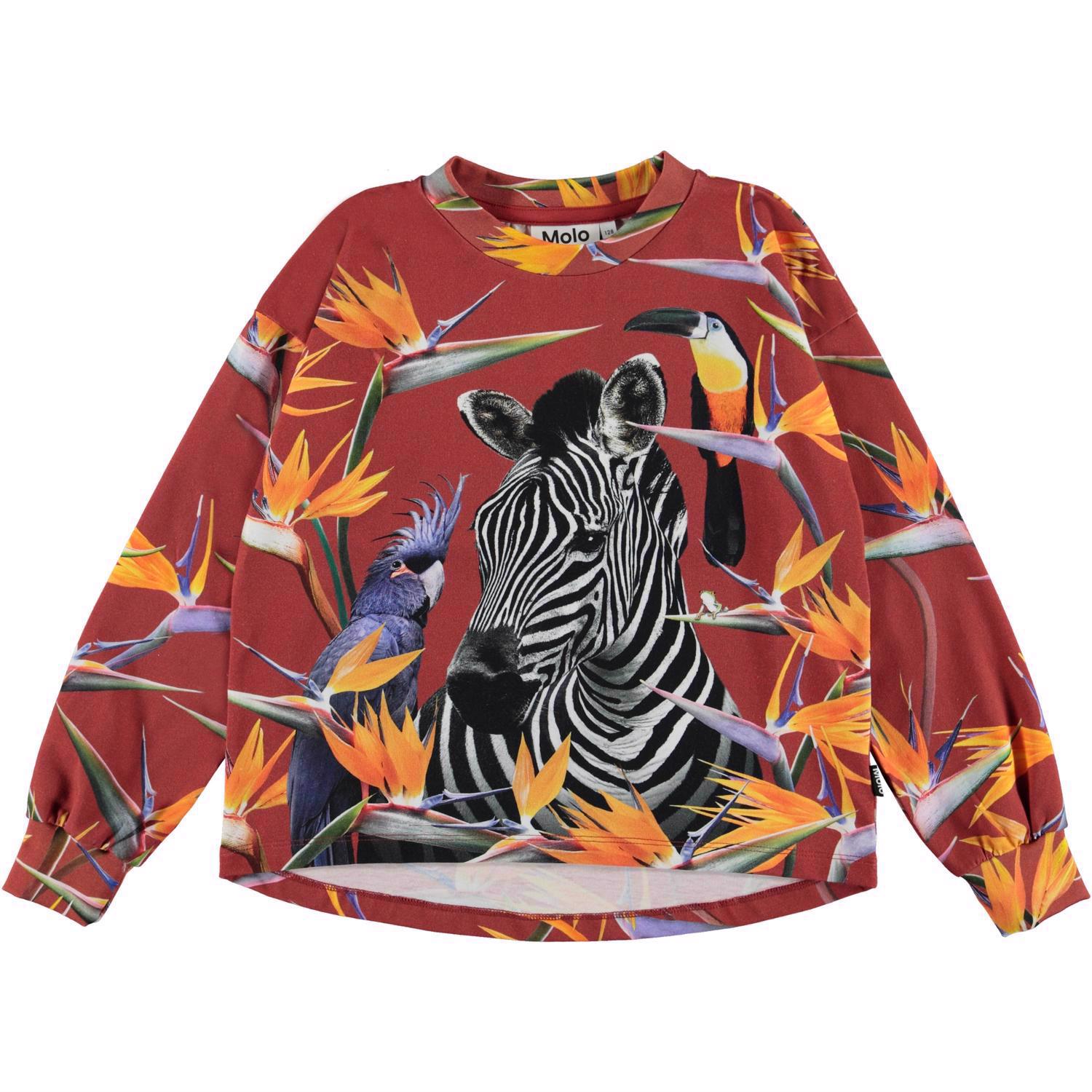 Reniza är en långärmad mörkröd tröja med exotiska orangea blommor, em zebra och fåglar. Tröjan har något mer längd baktill.