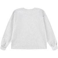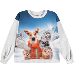 Blå och grå långärmad topp i mjuk ekologisk bomull med muddar och halsringning i ribbat material. Toppen har en lös passform och är längre baktill med söta djur som tar en selfie i ett vackert snötäckt landskap.