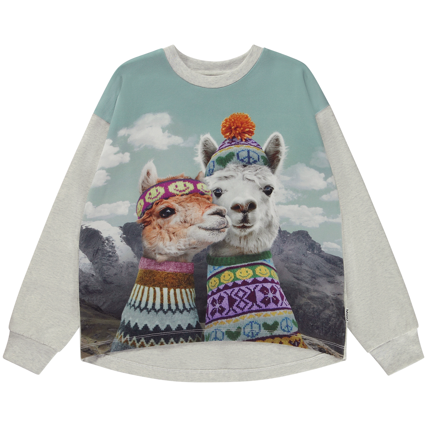 Gråmelerad träja med roliga lamor som är fulla av humor. De har fått Molo´s egna stickade plagg på och är ordentligt påklädda i mössor, halsdukar och tröjor. Denna tröja är tillverkad i 100% bomull, har långa ärmar med ribbkant, rund hals med ribbkant och en lös passsform.