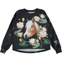 Reniza är en mörkblå tröja med en häst som sticker ut huvudet mellan näckrosor. Tröjan har en något bredare passform som faller fint på kroppen.