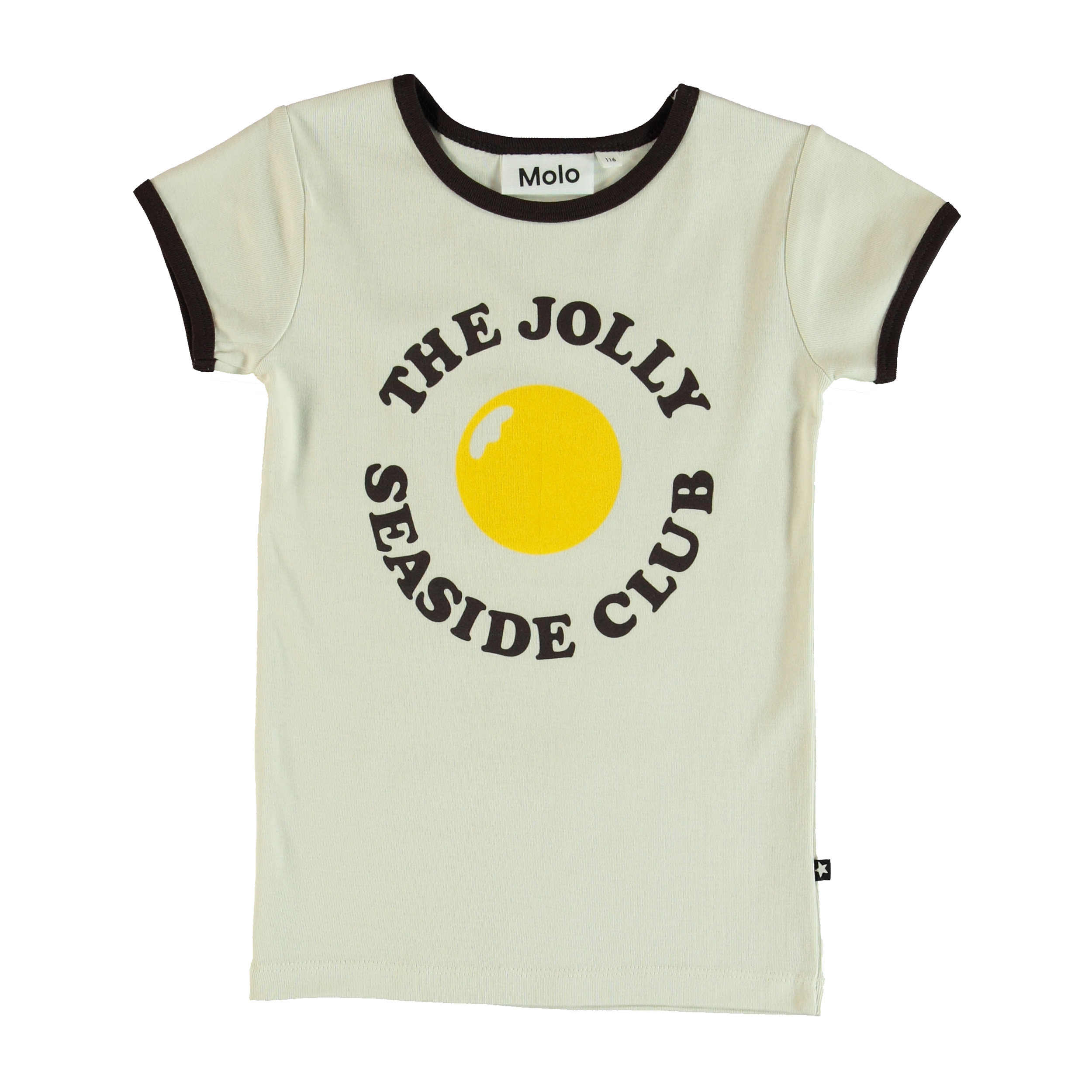 Rhiannon är en ringad t-shirt med svarta kantband och vintage inspirerat tryck fram med text på bröstet.