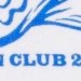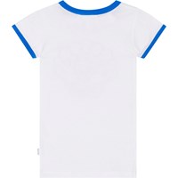 Vit tight t-shirt i ekologisk bomulll. T-shirten har blå kantband vid hals och ärmar, som matchar mönstret framtill. Mönstret är en snäcka med texten "Ocean Club 2024".