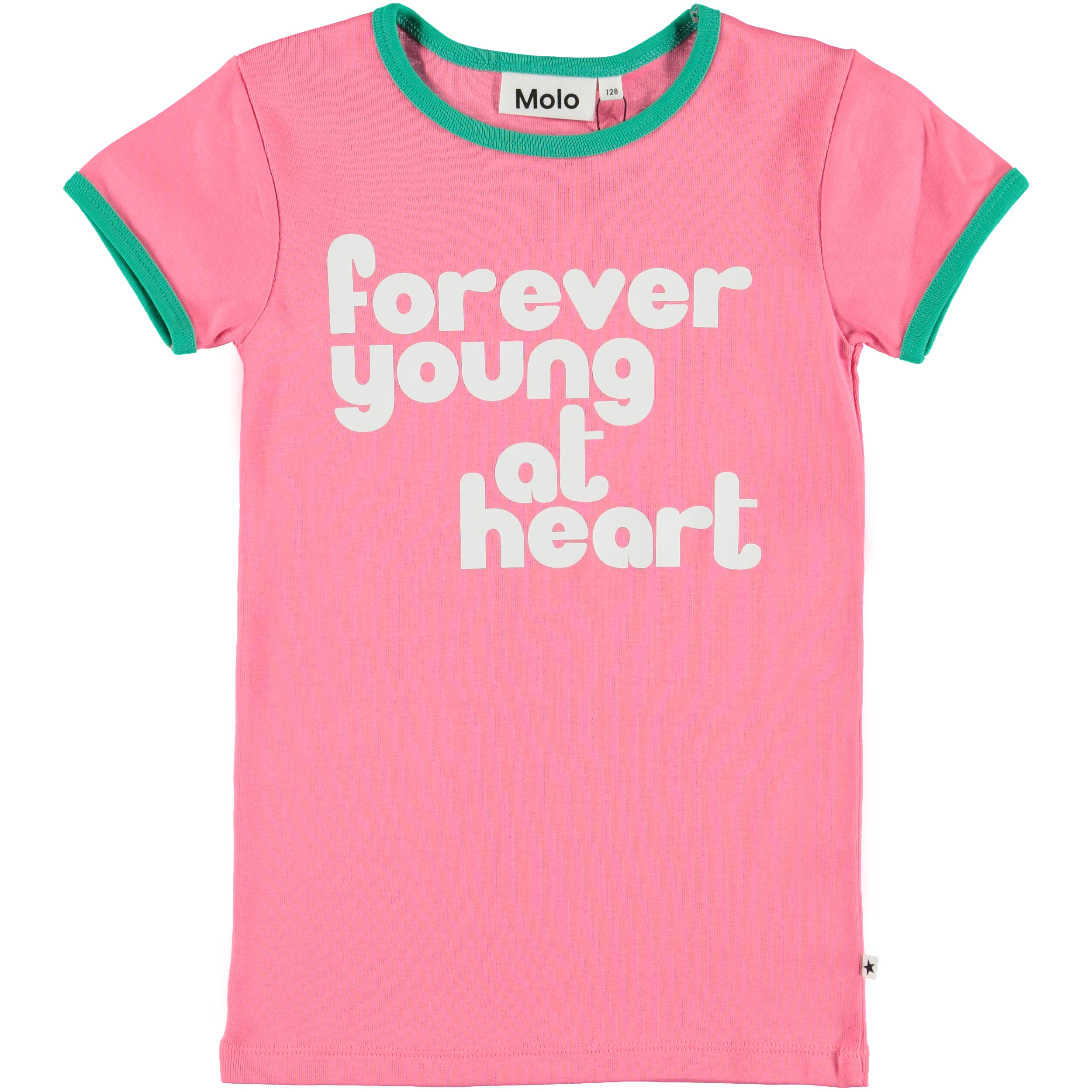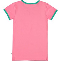 Forever young at heart' är statementet på t-shirten Rhiannon. Så hitta din lekfulla sida och var evigt ung i denna coola t-shirten. T-shirten är en ljusrosa ringad t-shirt med gröna kanter vid ärmar och halsringning.