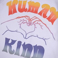 Lila kortärmad T-shirt i mjuk ekologisk bomull med texten ''Human Kind'' och händer som formar ett hjärta framtill. T-shirten är figurnära, har en rund halsringning och kantband i en matchande färg.