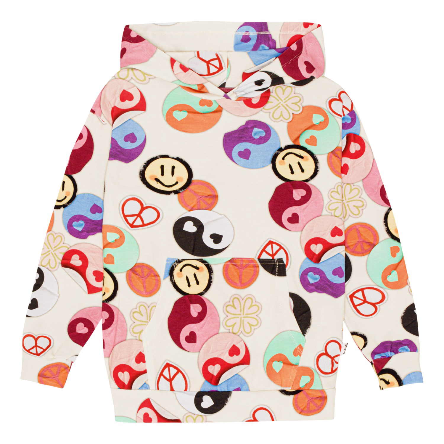Långärmad luvtröja i ekologisk bomull med Yin och Yang mönster. Tröjan har en normal passform med låga axelsömmar, känguruficka och ribbkant i halsen, på ärmarna och nertill.