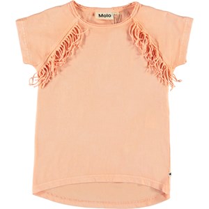 Riana är en korall färgad t-shirt, som har raglan ärmar med fransar. T-shirten är längre baktill.