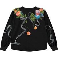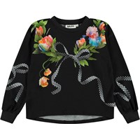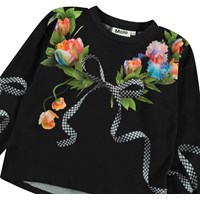 Svart sweatshirt i mjuk ekologisk bomull med en rund hals och muddar i ärmslut och hals. Sweatshirten har en lös passform med ett färgglatt mönster av konstnärliga tulpaner och rosetter knutna i rutiga band.