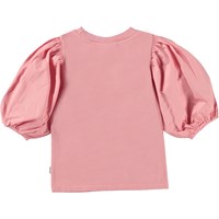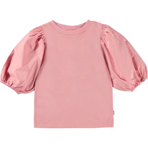 Rosa tröja med puffärmar i bomullspoplin. Denna tröja är tillverkad i 100% bomull, har en rund halsmedribbkant, korta ärmar med puff och en normal passform.